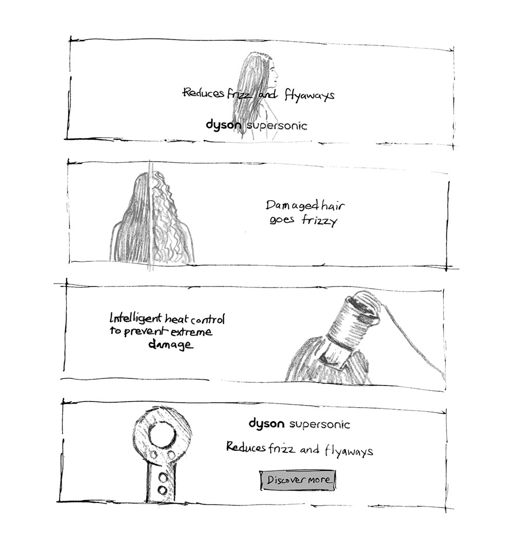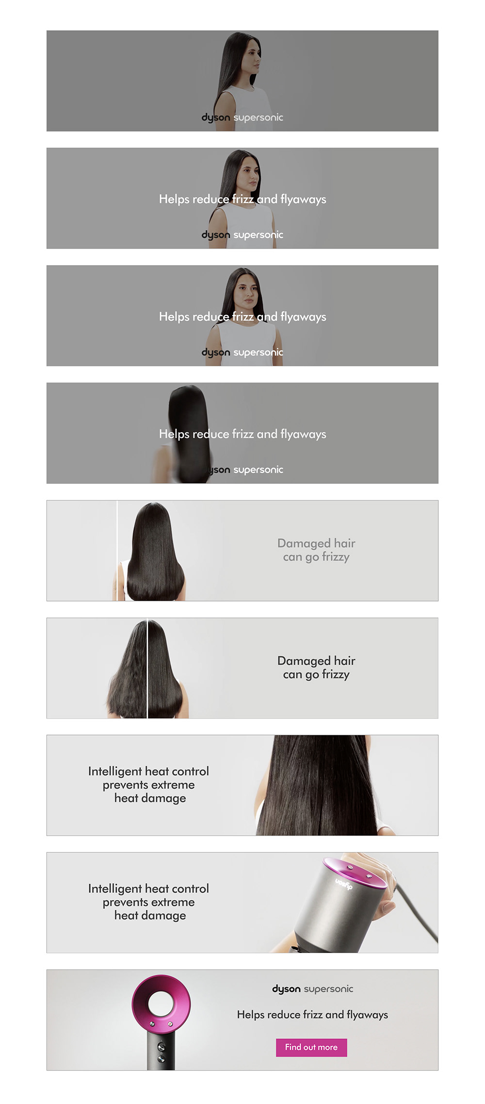 My work for Dyson began in 2015, when I was briefed on the pivotal luxury hair dryer 'Supersonic'. Under my creative, art and production direction, Spicerack built the enormous online launch campaign, including translations across 34 global territories. From there, working with Dyson's exceptional in-house creative team, I led the production of 100s of online campaigns across all categories for over 6 years. Before exiting my founding ECD role, I negotiated the agency's retained services contract with Dyson; the brand's first such agreement with a digital creative agency. I've chosen to show just one project. My responsibility for Dyson was clear: best-practice, highest quality production, creatively directed by Dyson's creative teams. On occasions of extreme bottlenecks, I supported on the full package; working with supplied photographic assets, I assisted with ideas and designs, and worked on the final production. As follows is one such example...