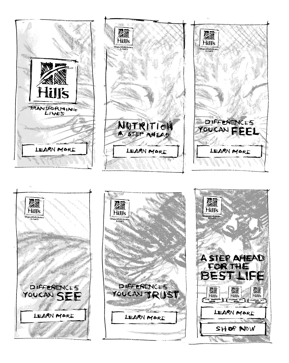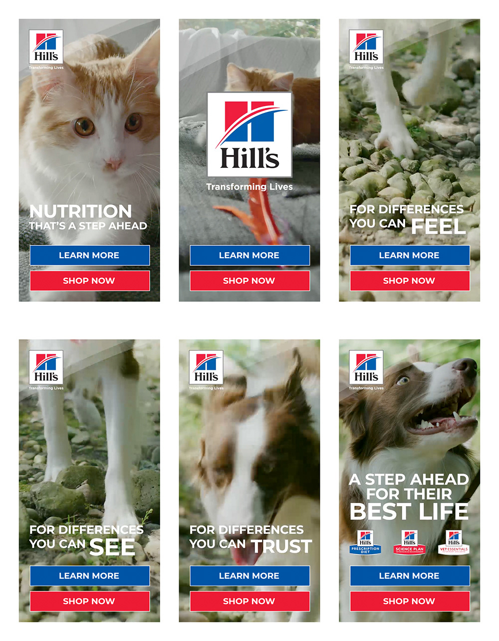 For Hill's Pet Nutrition, I was briefed on an online campaign highlighting 3 key ranges. We were presented with a range of video assets of cats and dogs, but a media plan that required standard media only. We applied our passion for file-size wizardry, and were able to create a rich and dynamic campaign with full-bleed animation; it felt like video, but required no rich media serving or costs. I worked on 7 online campaigns for Colgate-Palmolive owned Hill’s, between 2019 and 2020.