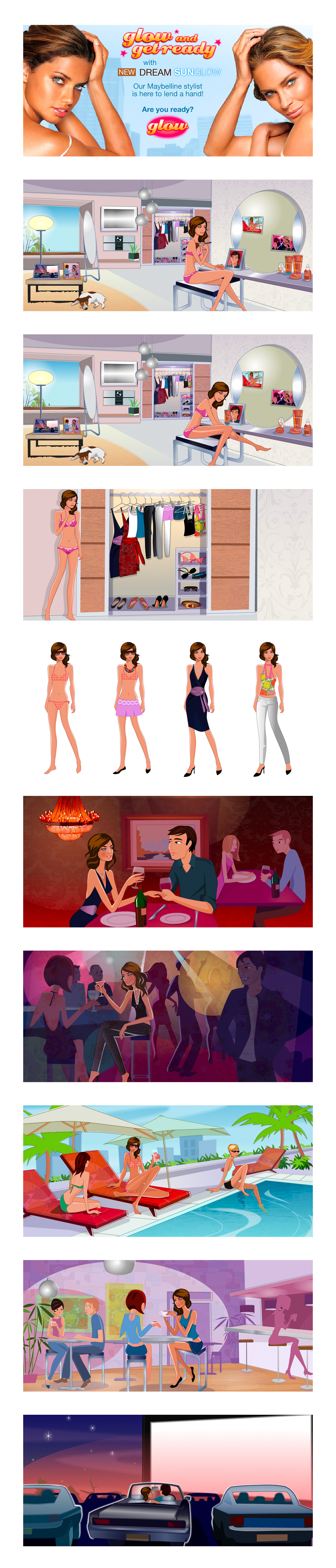 Maybelline New York had an idea for a game for their new Dream Sun Glow Bronzer range. I worked with them on scripts and storyboarding, and then took on the task of designing and building it, briefing the scene creative to illustrator / animator Luella Wright. The game allowed the player to choose from the Sunglow products, and then select from an extensive wardrobe of outfits. A range of dating outcomes matched the make-up and outfits. I produced online campaigns, landing pages, games and rich emails for L’Oréal Group brands including Garnier and Maybelline New York for 5 years, from 2006 to 2011.