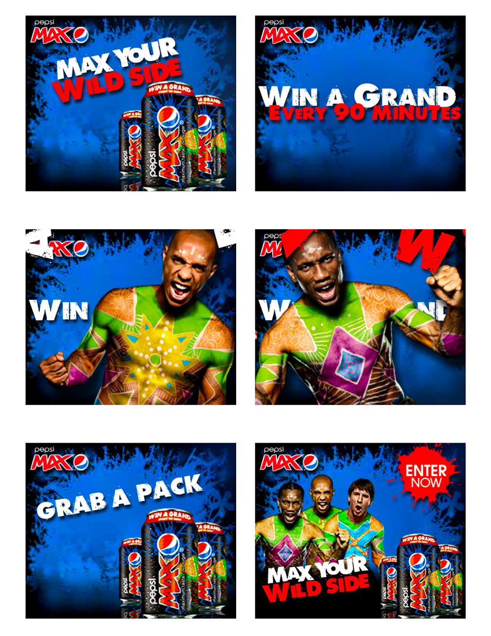 This Pepsi campaign was to promote a competition website on which a grand could be won every 90 minutes. Using the mechanics of the competition, website and all available assets, I presented scamped ideas which, once approved, I designed and built across a range of online formats. I was called upon by digital agency 20:20 (now Jaywing) to support them with online campaigns for their client PepsiCo from 2008 - 2012. I worked on numerous projects for Pepsi Max and Mountain Dew throughout this time, from ideas through to design and production - often all 3.